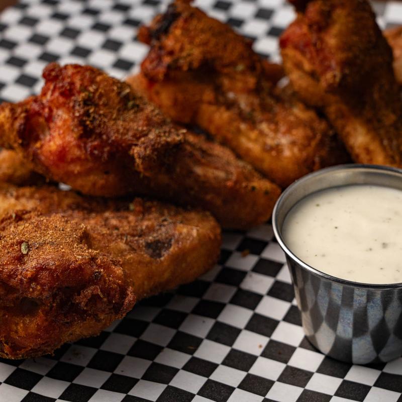 Buffalo, Garlic Parmesan, Sticky Black Vinegar, Sweet Jerk Dry Rub (contains peanuts).
